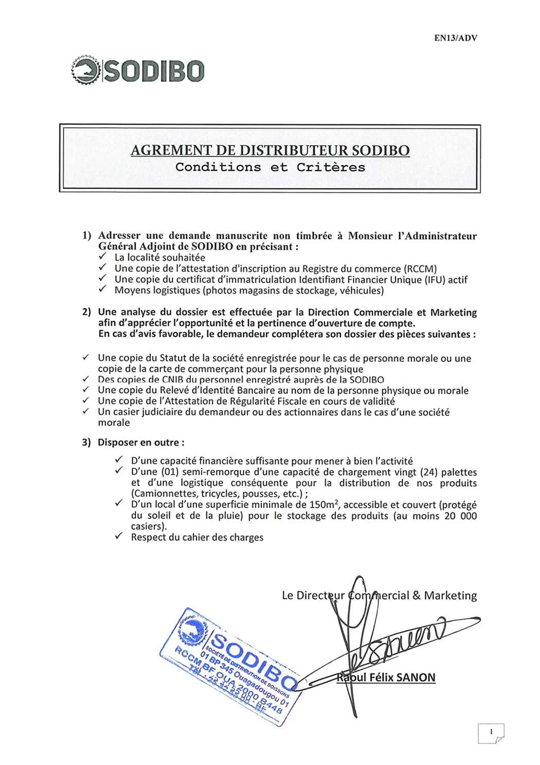Agrement de distributeur sodibo (Conditions et critères)